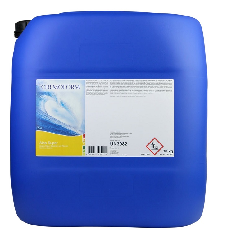 Оптимальный уровень рН: 7,0-7,4. После чистки бассейна перед его наполнением следует нанести 1%-ый раствор “Альба Супер К” на поверхность чаши бассейна для уничтожения сохранившихся и уже появившихся грибков и водорослей. Дозировка: для первичной обработки необходимо 150мл альгицида на 10м³ воды. Затем каждые 14 дней добавлять по 100мл на 10м³ воды. При высоких температурах и осадках дозу следует увеличить.